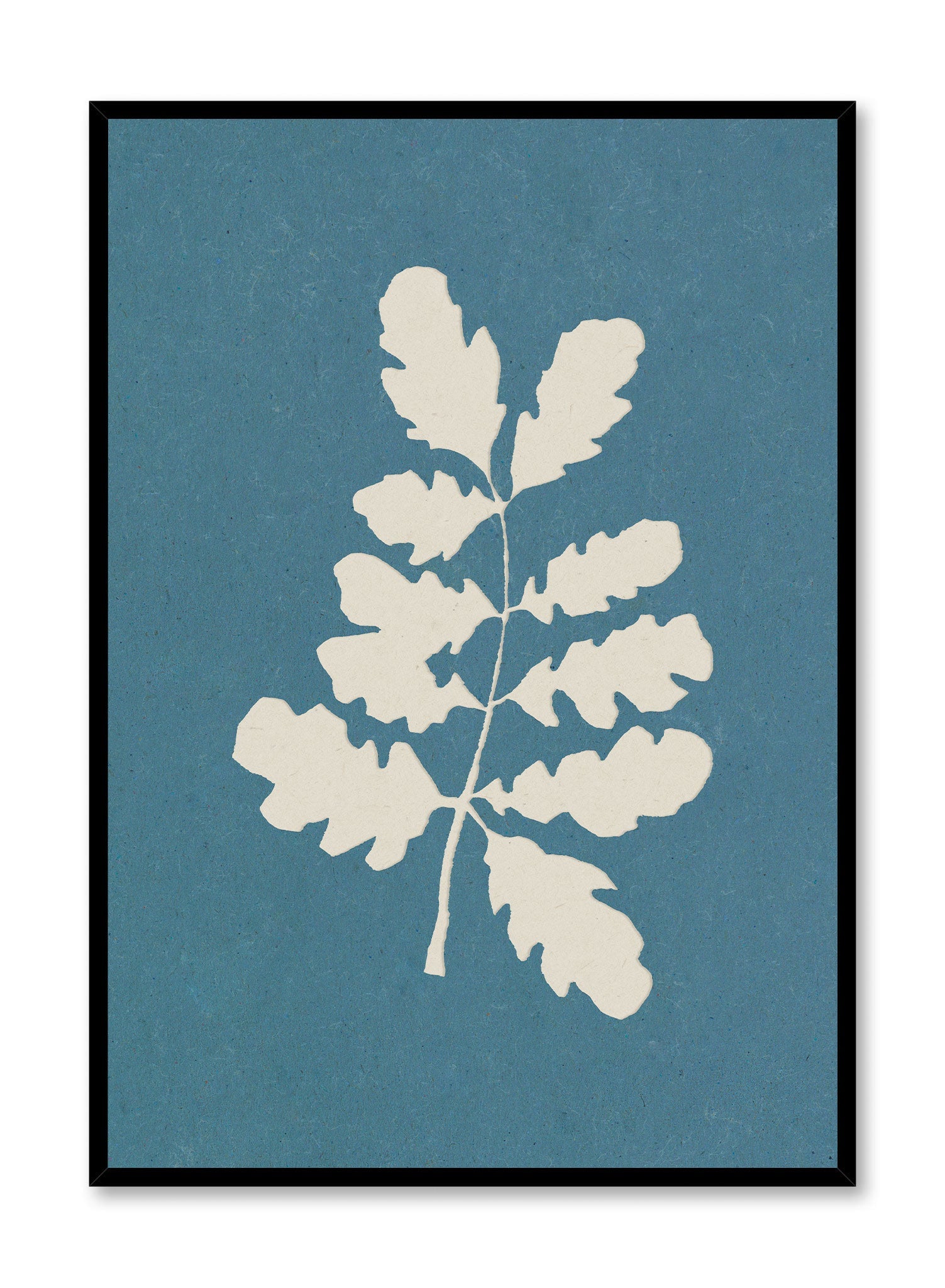 A silhouette of white oak leaves spreads gracefully across a textured blue background, the delicate contours creating an elegant, organic form. The minimal composition feels refined and calming, capturing the quiet beauty of nature.