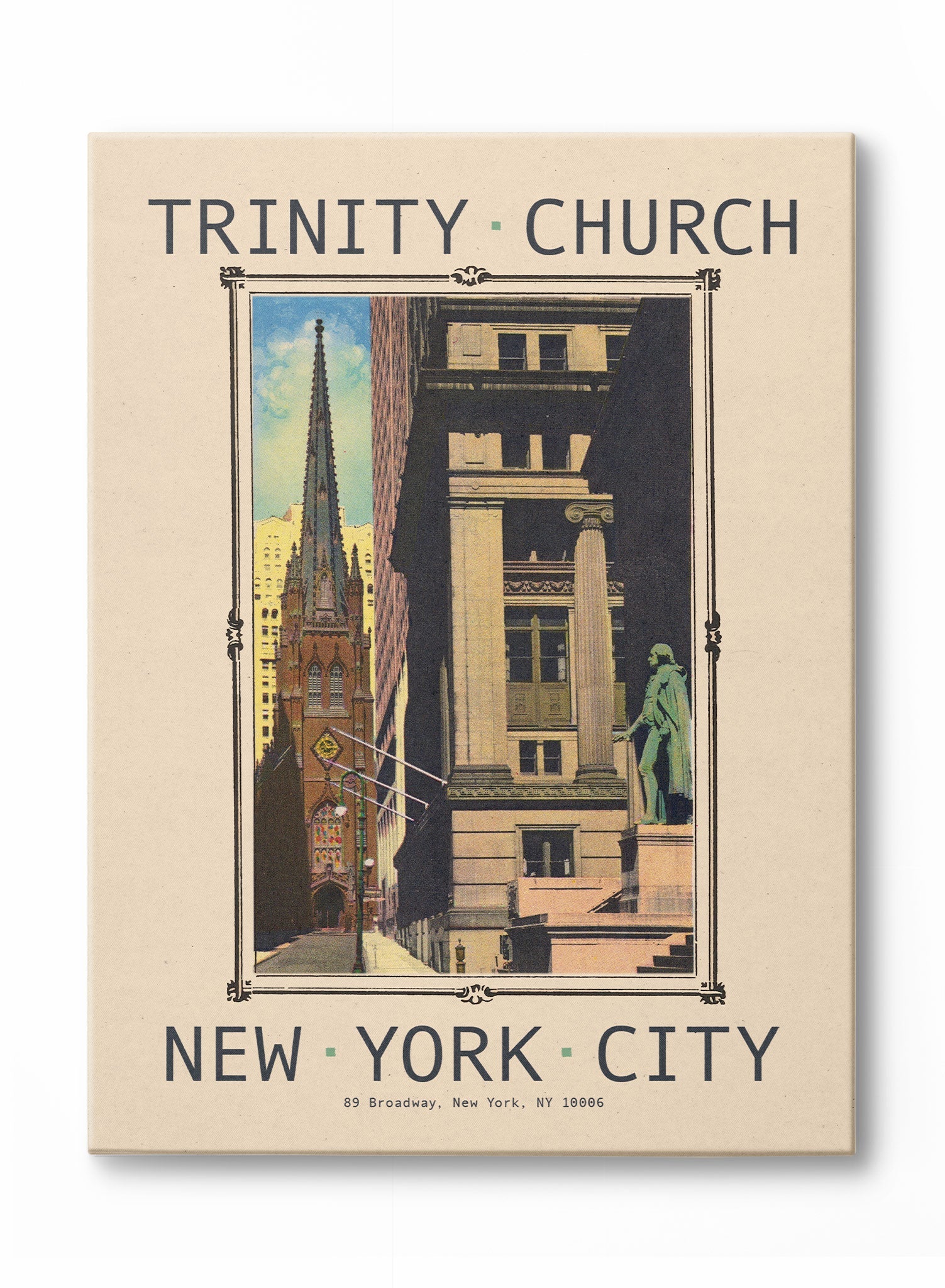 This print showcases the striking Gothic architecture of Trinity Church nestled in the heart of Manhattan’s historic streets. Framed by ornate lettering and muted tones, the composition celebrates the intersection of history and modernity.